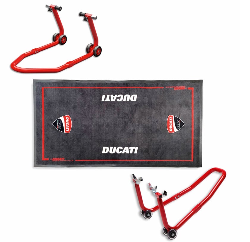 バイクを安全に持ち上げて駐車するのに不可欠なアクセサリーセットです。このパッケージは、Ducati Performanceのクラフトマンシップの高い信頼性がすべて揃っています。実用性に極めて優れたフロントボックススタンド、リアボックススタンド、便利なマットが付属します